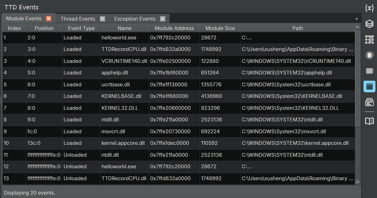 - Note: The TTD sidebar icons are hidden when you are not actively debugging. They will appear in the sidebar when you start a TTD debugging session.