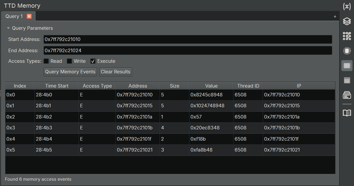 ⚠️ Important: All TTD queries (Calls, Memory, Events) execute synchronously and block the Binary Ninja UI until they complete. There is currently no way to interrupt a running query due to a WinDbg backend limitation. Long-running queries on large traces can cause the UI to appear frozen for several minutes.