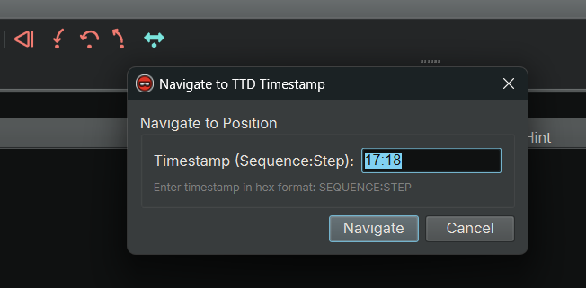 - There is a "Navigate To TTD Timestamp..." button in the debugger controls. When clicked, a dialog pops up showing the current TTD timestamp (position) and allows you to enter a new timestamp to navigate to. This provides a convenient way to jump to specific positions in the trace without using console commands.
