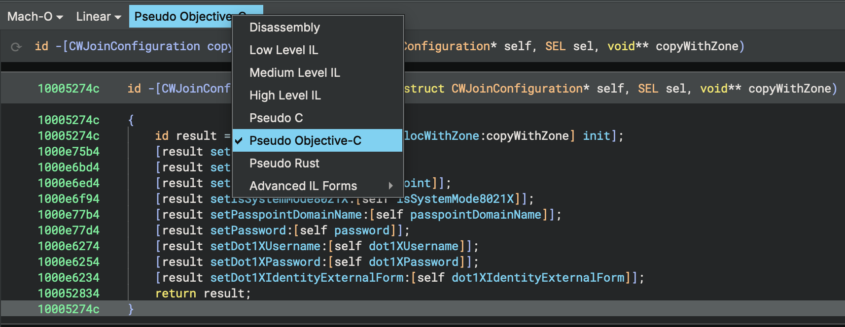 Binary Ninja ships with built-in functionality for assisting with Objective-C analysis. A brief summary of the features offered is as follows: